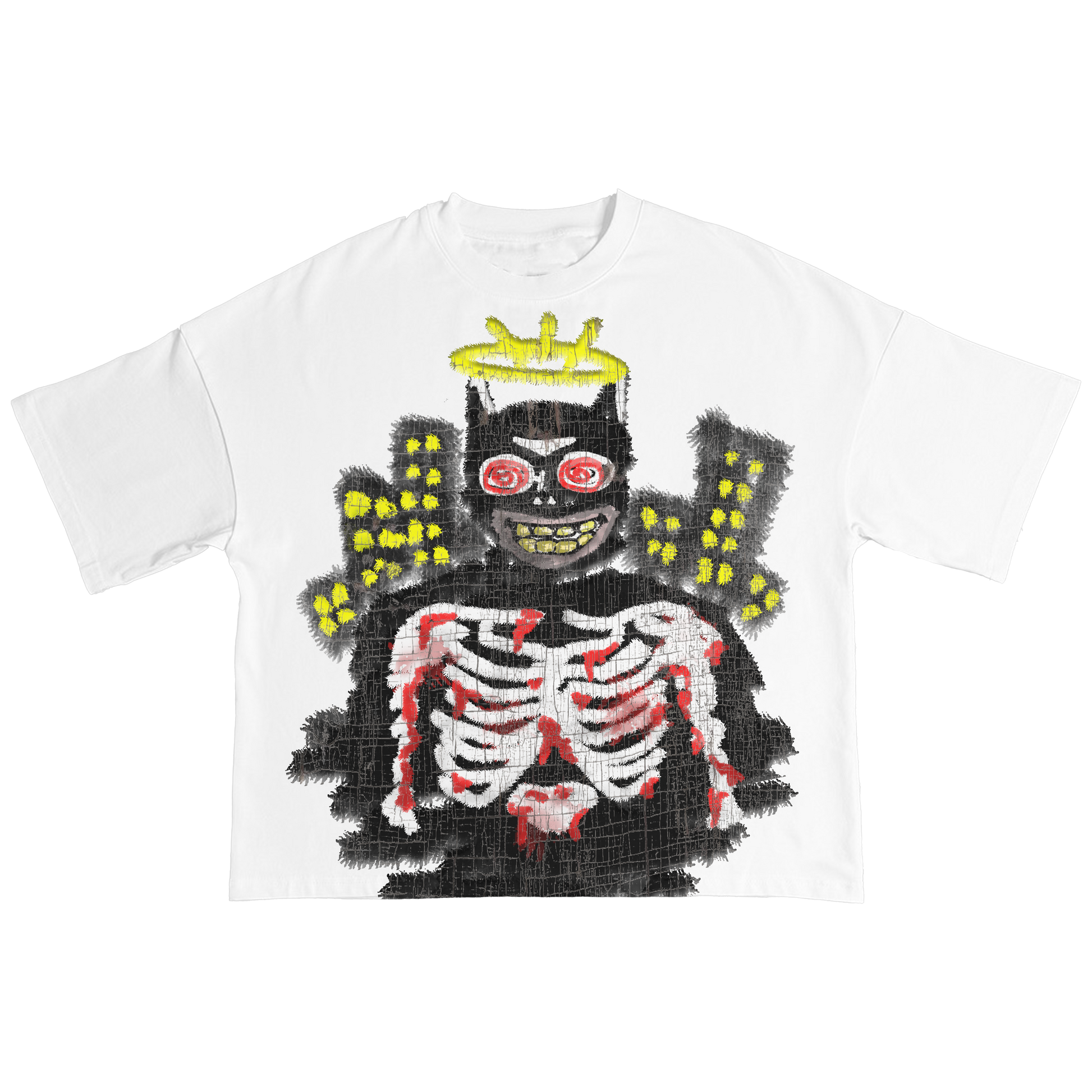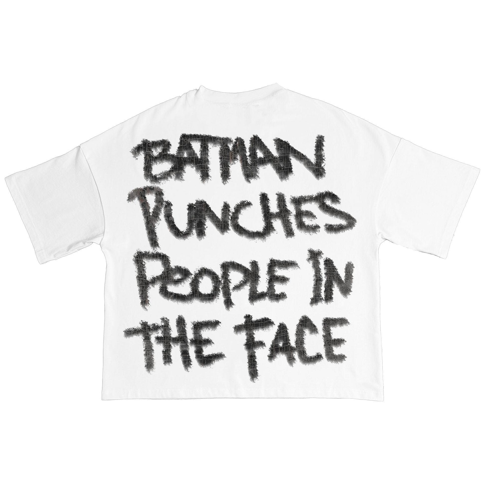 Unleash your inner hero with our bold “Batman Punches People in the Face” T-shirt. Featuring an eye-catching graphic of a fierce Batman on the front inspire by Jean-Michel Basquiat. This shirt captures the essence of the iconic character with a playful twist. The back boldly proclaims the humorous slogan, making a statement that's sure to turn heads. Crafted from soft, high-quality fabric, this T-shirt offers ultimate comfort while showcasing your unique style. Perfect for comic book fans and those who love to stand out, it's a must-have addition to your wardrobe. Wear it to your next comic convention or casual outing, and let your love for Gotham shine!